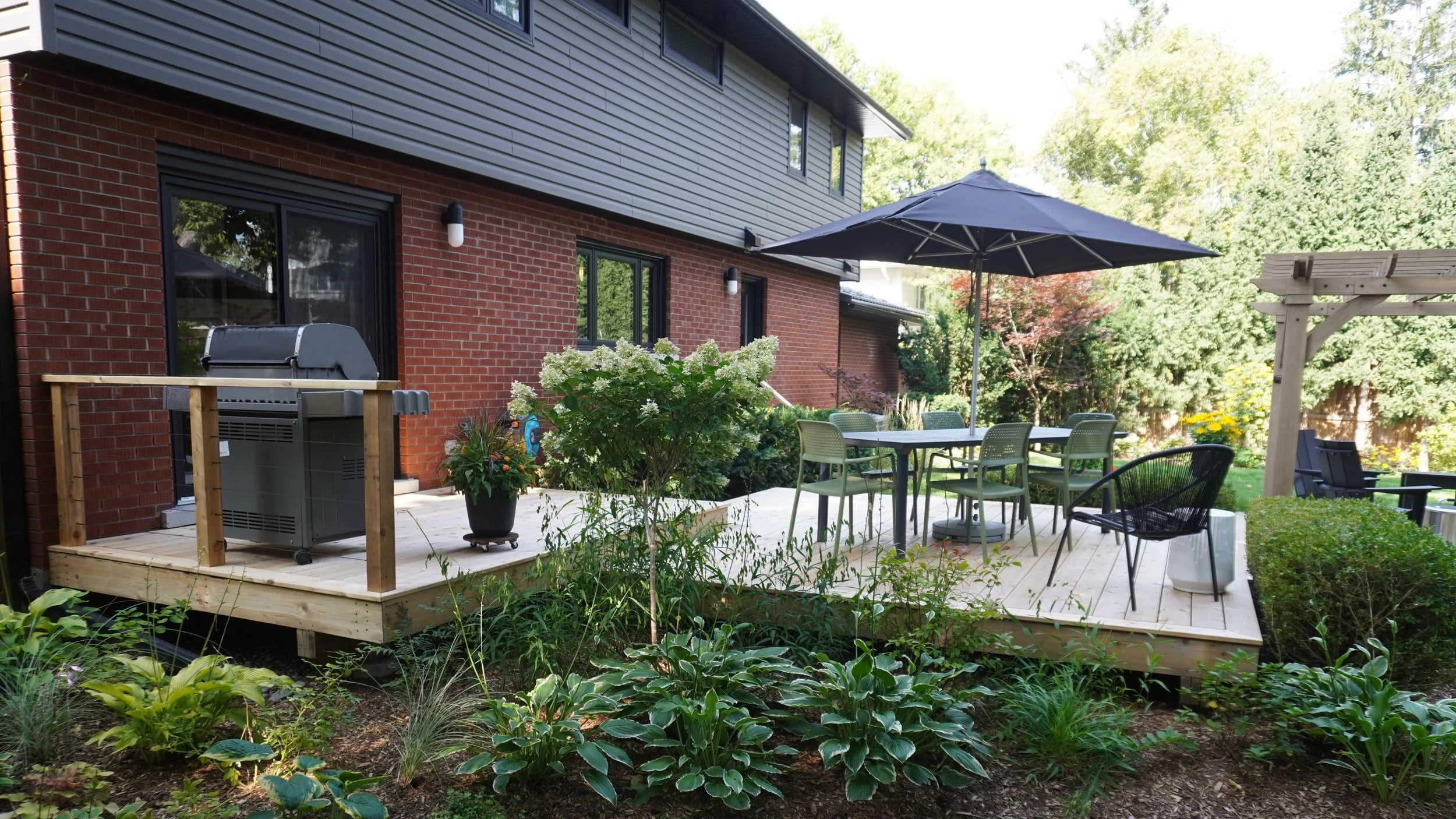 This cedar deck revival was simple but effective. After years of weather it was time for a resurfacing to refresh this beautiful backyard. The resurfacing was accompanied by the addition of a pergola to add another element to tie the space together, pictured below. Our crew also installed mulch and flowers, trimmed the surrounding hedges, and added furniture to make the most out of the space.